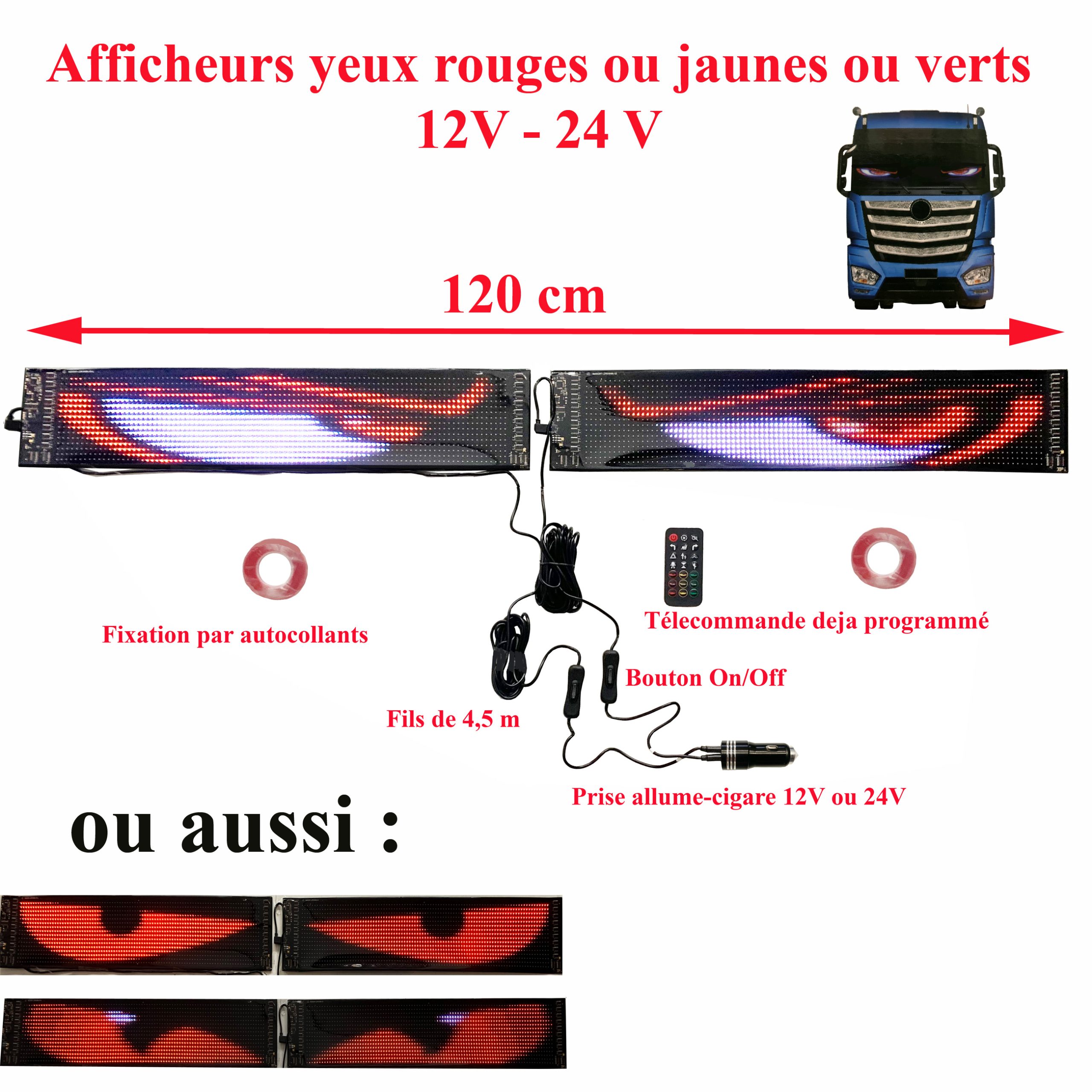Deux afficheurs défilants avec animations yeux rouges ou verts ou jaunes, Longueur total 120 cm X 12 cm fonctionne sur prise allume-cigare 12V ou 24V