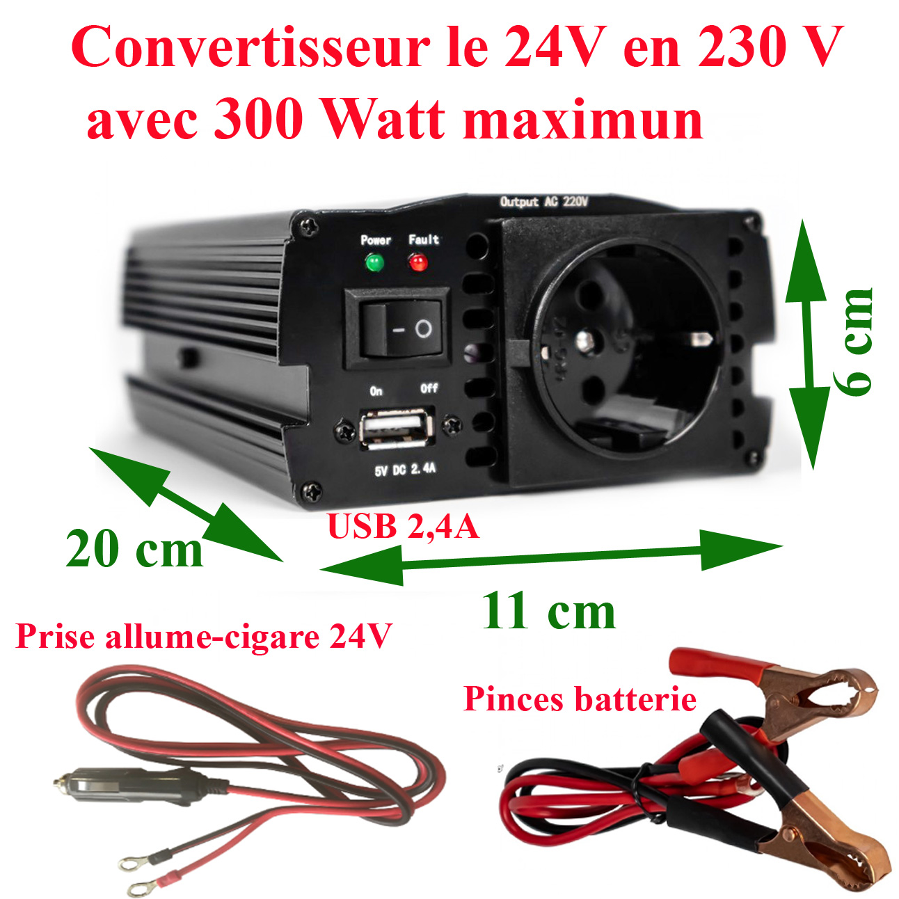 Convertisseur 24V en 220V avec une puissance maxi 300W avec prise USB, ne convient pas pour les micro-ondes (pas assez puissant).