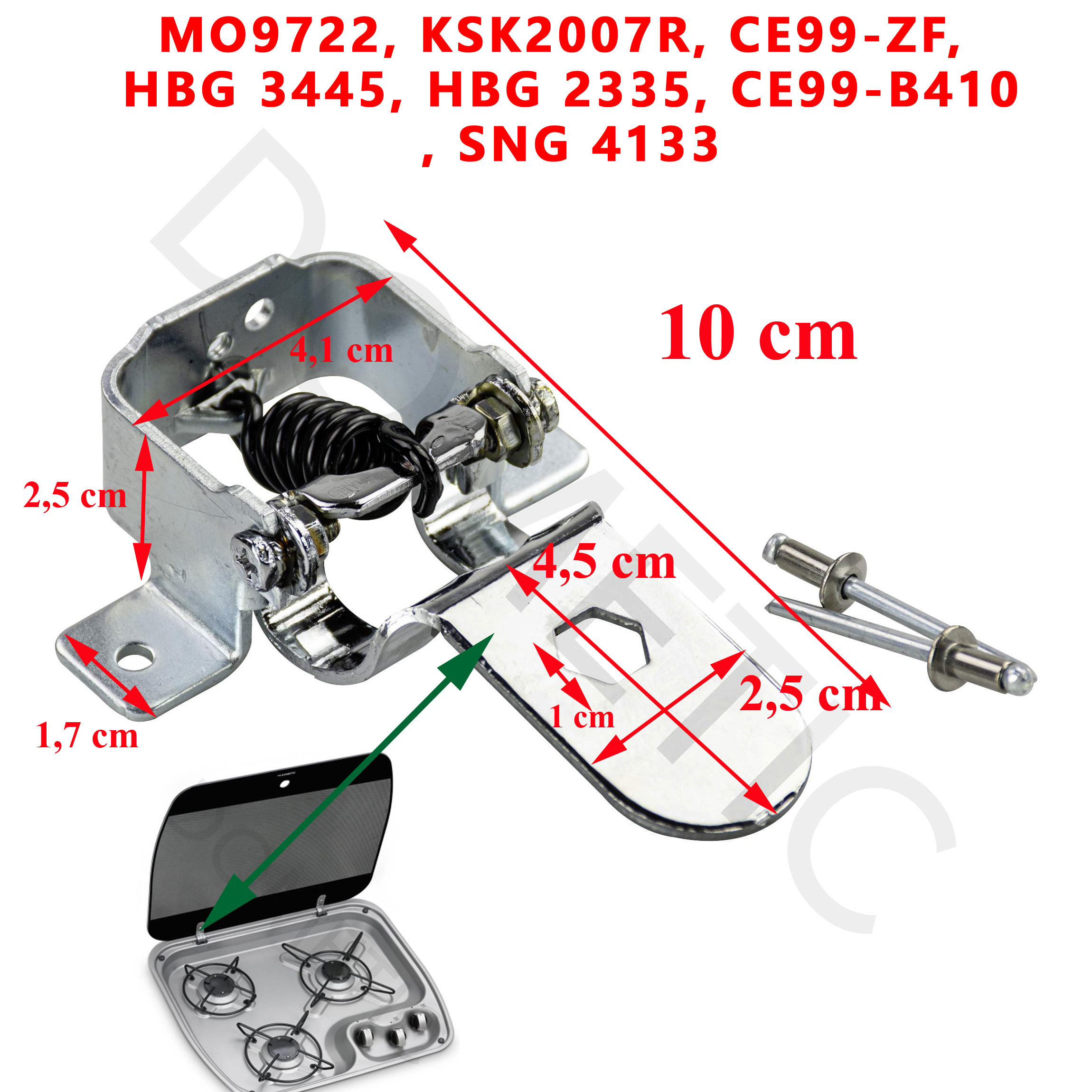 Dometic, charnière complète avec resort pour plaque en verre de réchauds, ou gaziniere Dometic MO9722, KSK2007R, CE99-ZF, HBG 3445, HBG 2335, CE99 B410, SNG 4133