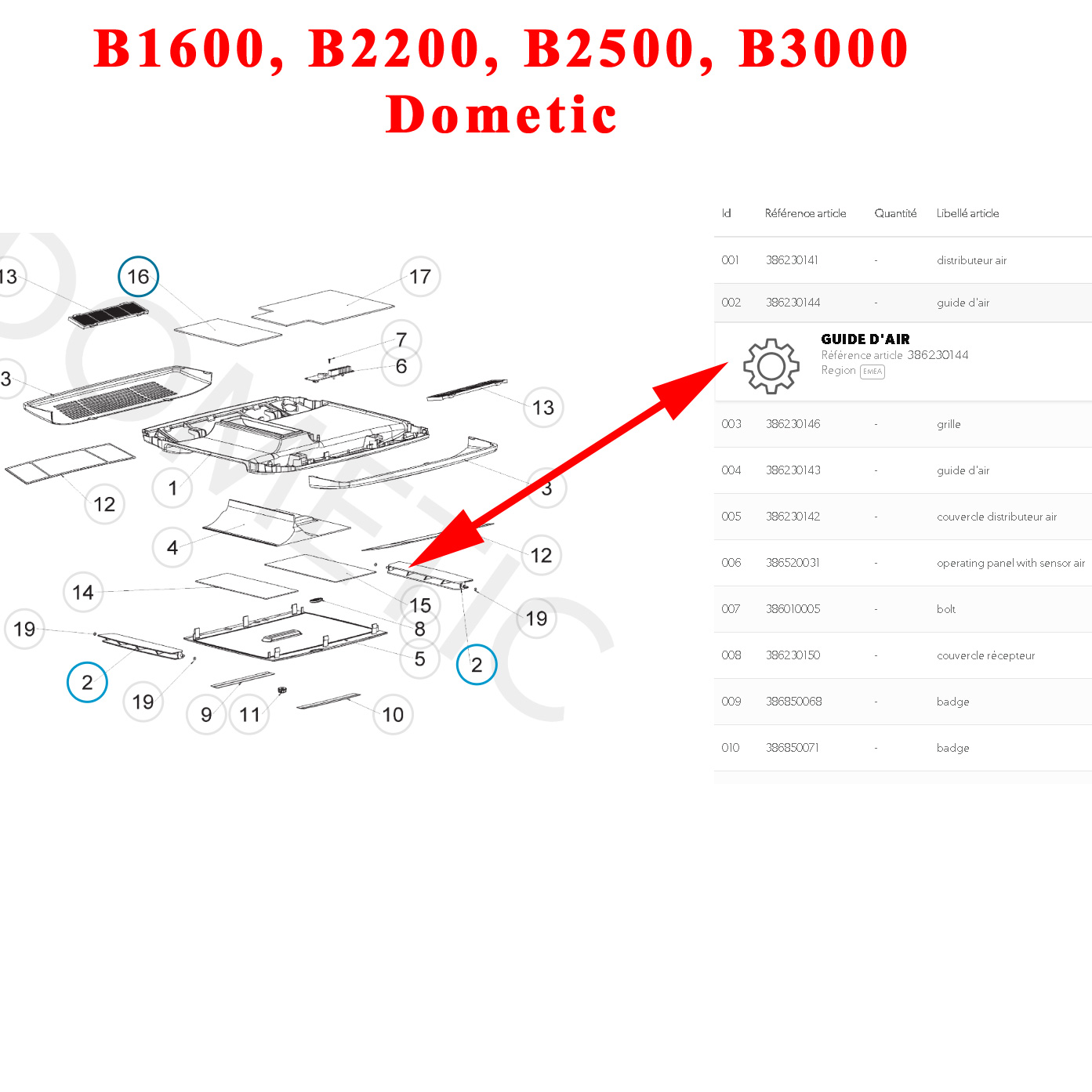 Pour vérifier si votre climatisationB300, B2200 ou B1600 Dometic comporte bien cette piece, merci de nous contacter tel 01.84.20.86.07 et munissez vous pour vérifier la compatibilité de votre numéro de produit Dometic (qui se trouve sur l’étiquette signalétique parfois sous le capot).