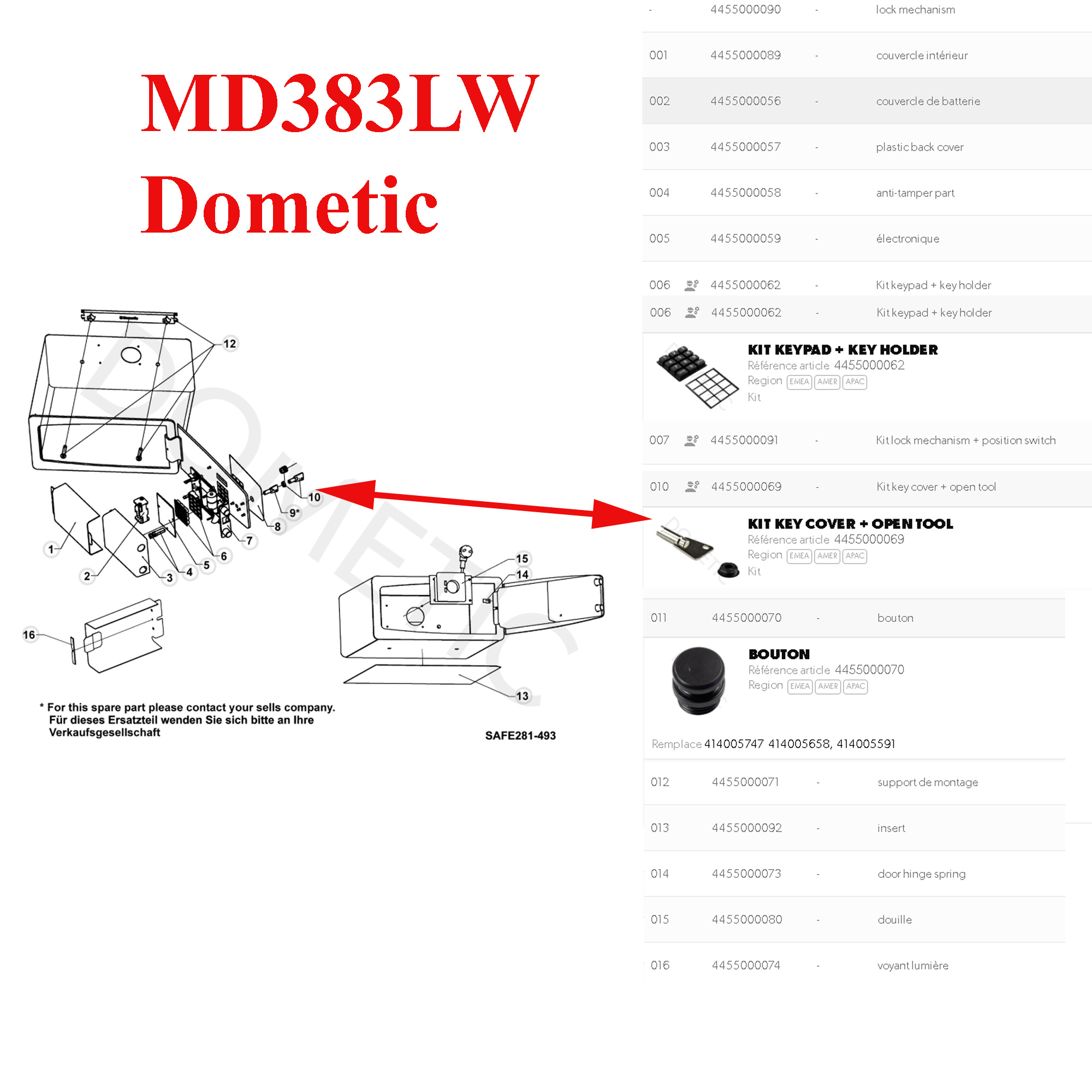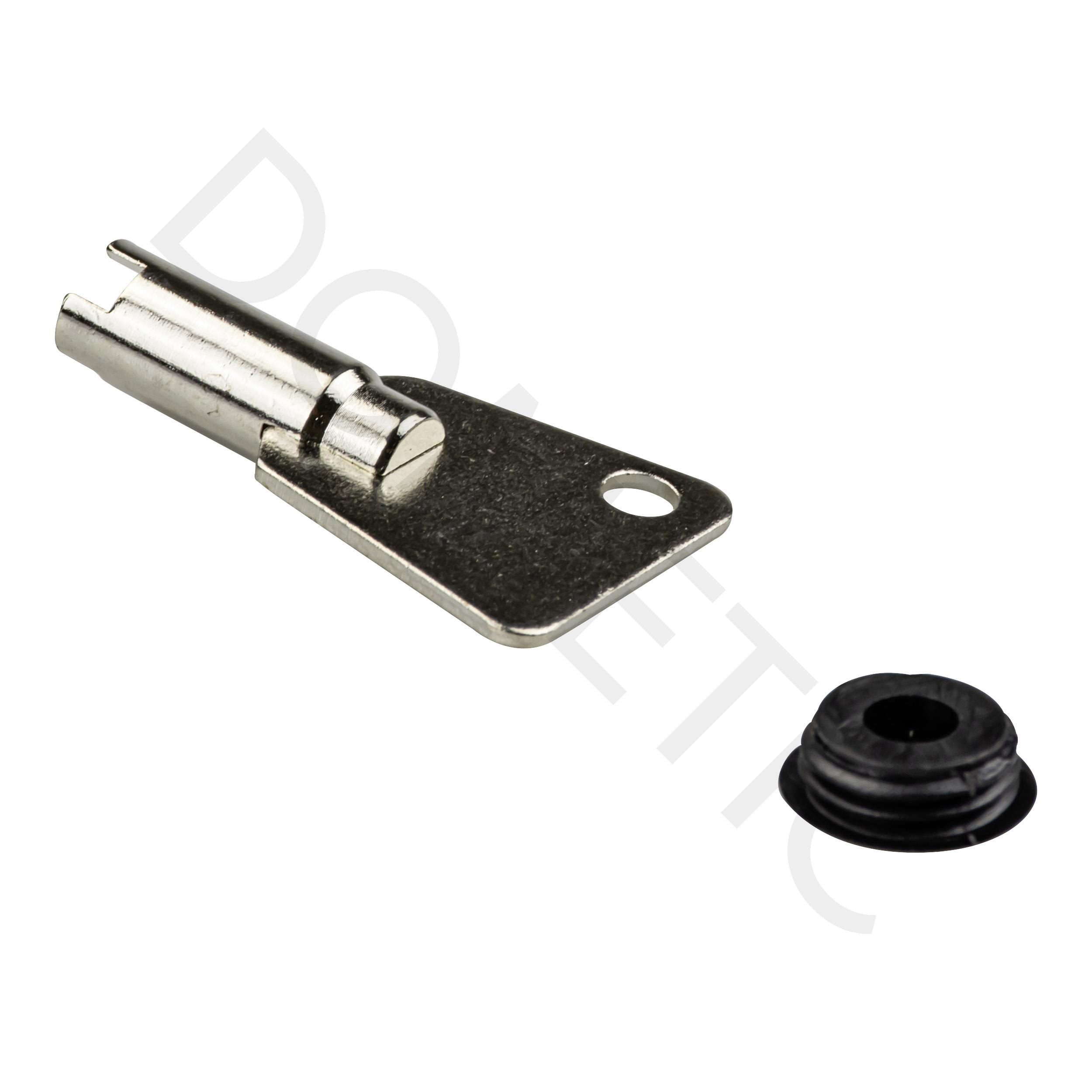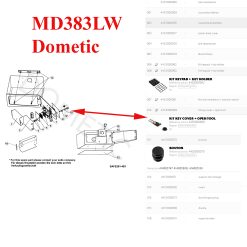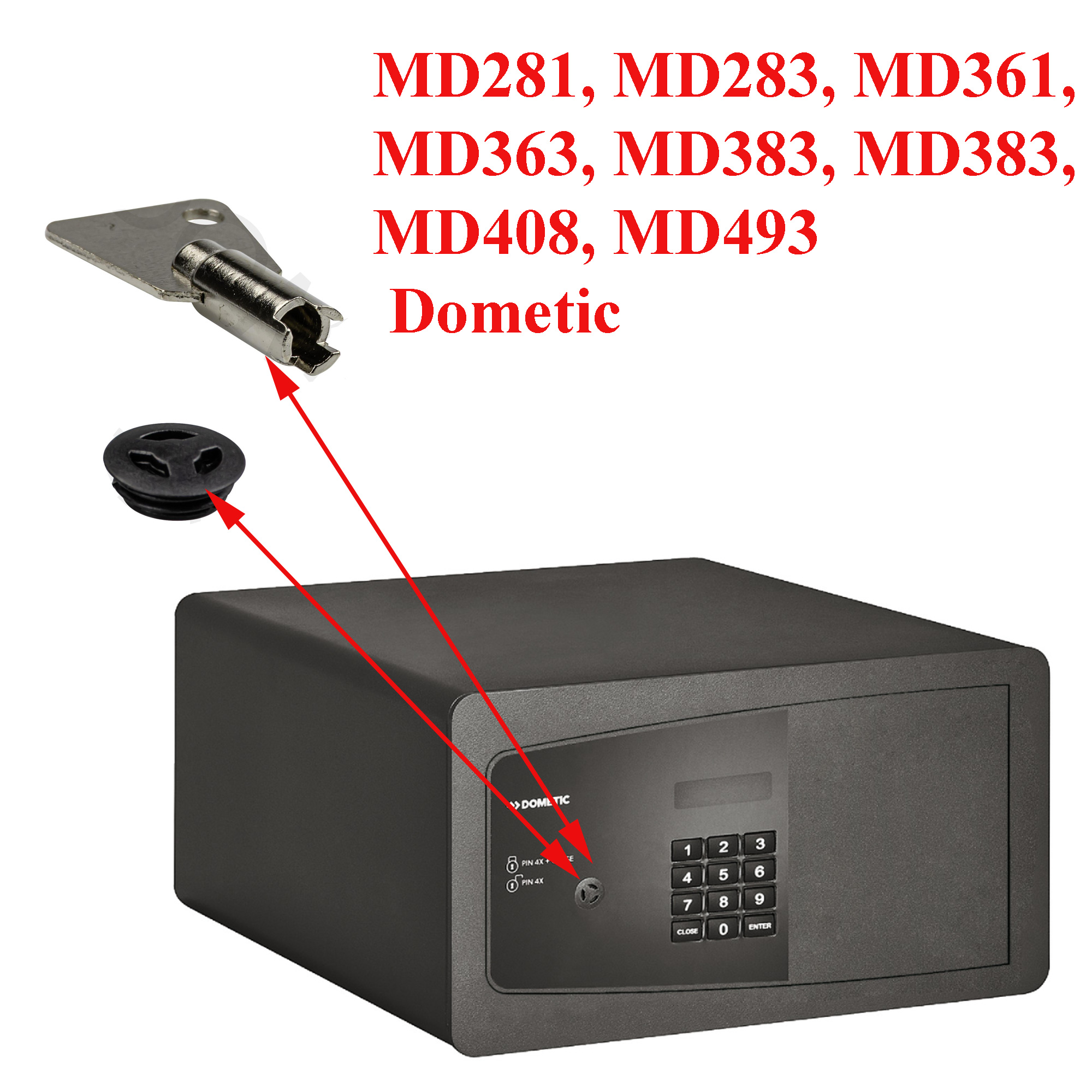 Dometic, la clef AVEC et le bouchon du coffre fort, cela ensuite permet d’atteindre la serrure : MD281, MD283, MD361, MD363, MD383, MD383, MD408, MD493