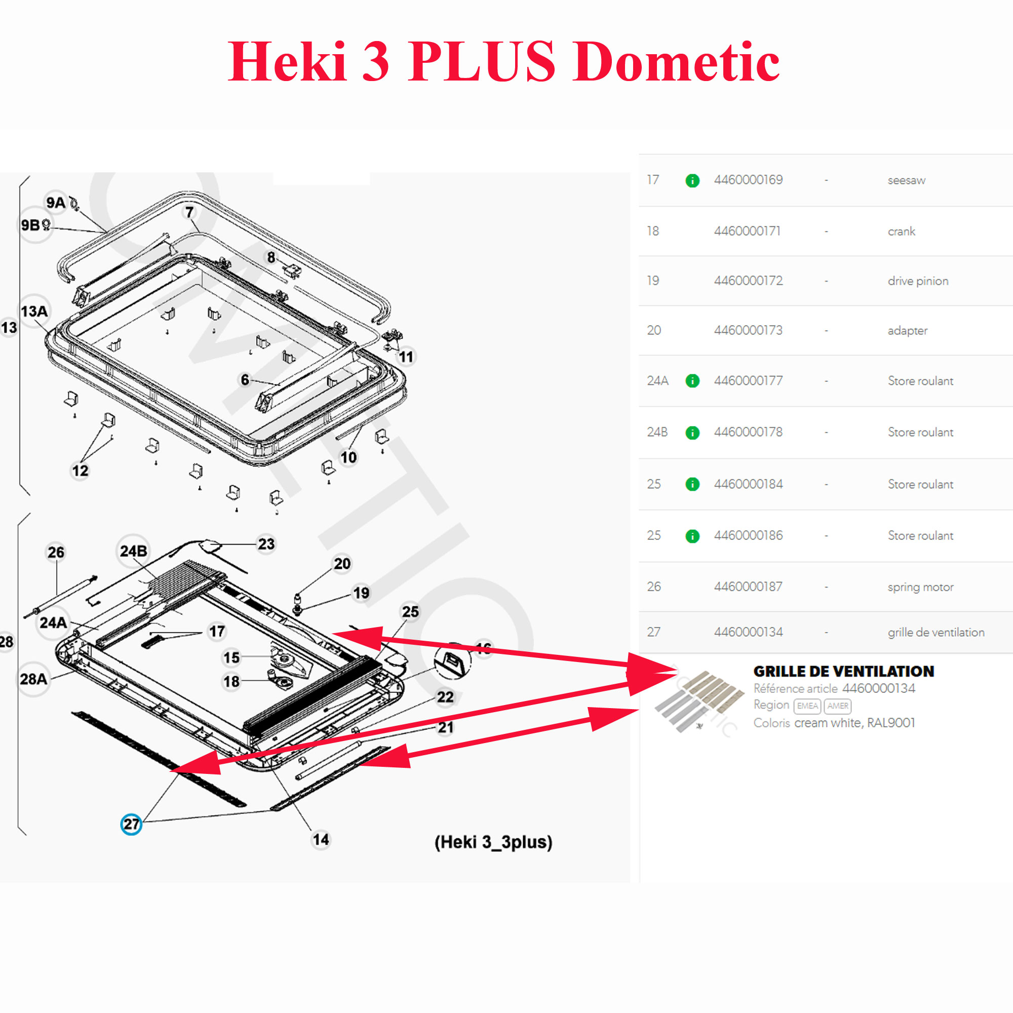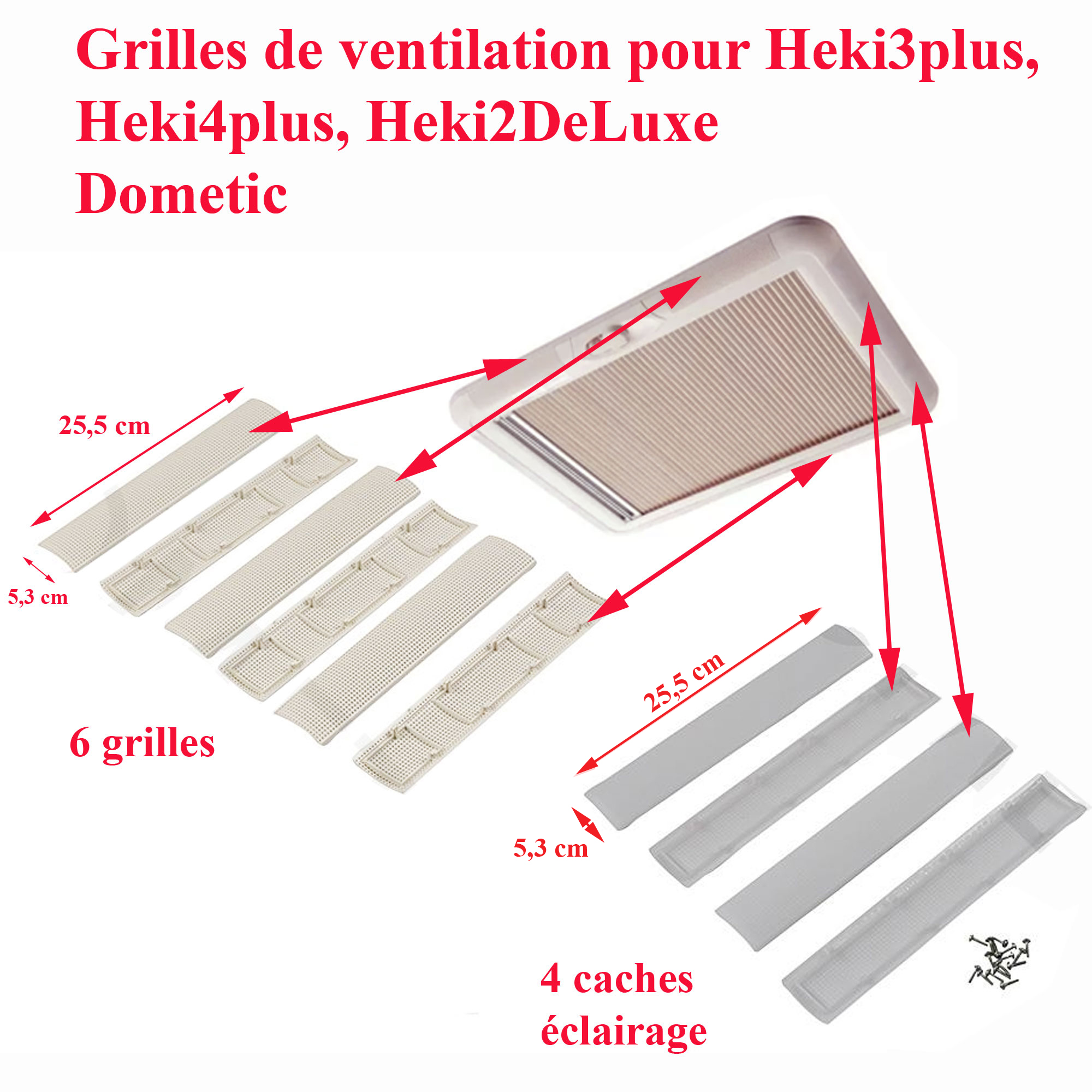 Pour vérifier si votre lanterneau Heki 3plus, Heki 4plus,comporte bien ces grille de ventilation et cache éclairage merci de nous contacter tel 01.84.20.86.07 et munissez vous pour vérifier la compatibilité de votre numéro de produit de votre appareil Dometic (qui se trouve sur l’étiquette signalétique).