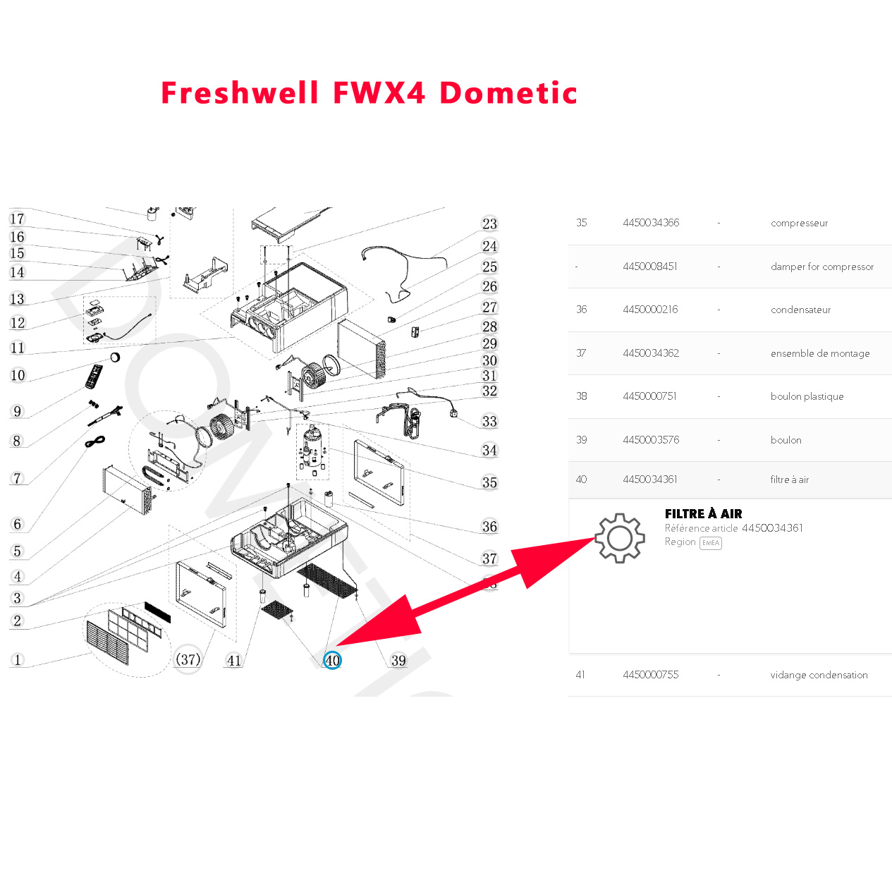 Pour vérifier si votre climatisation Freshwell FWX4 comporte bien les deux grille se trouvant en dessous, munissez vous pour vérifier la compatibilité de votre numéro de produit de votre appareil Dometic (qui se trouve sur l’étiquette signalétique) ou contactez nous au 01 84 20 86 07.