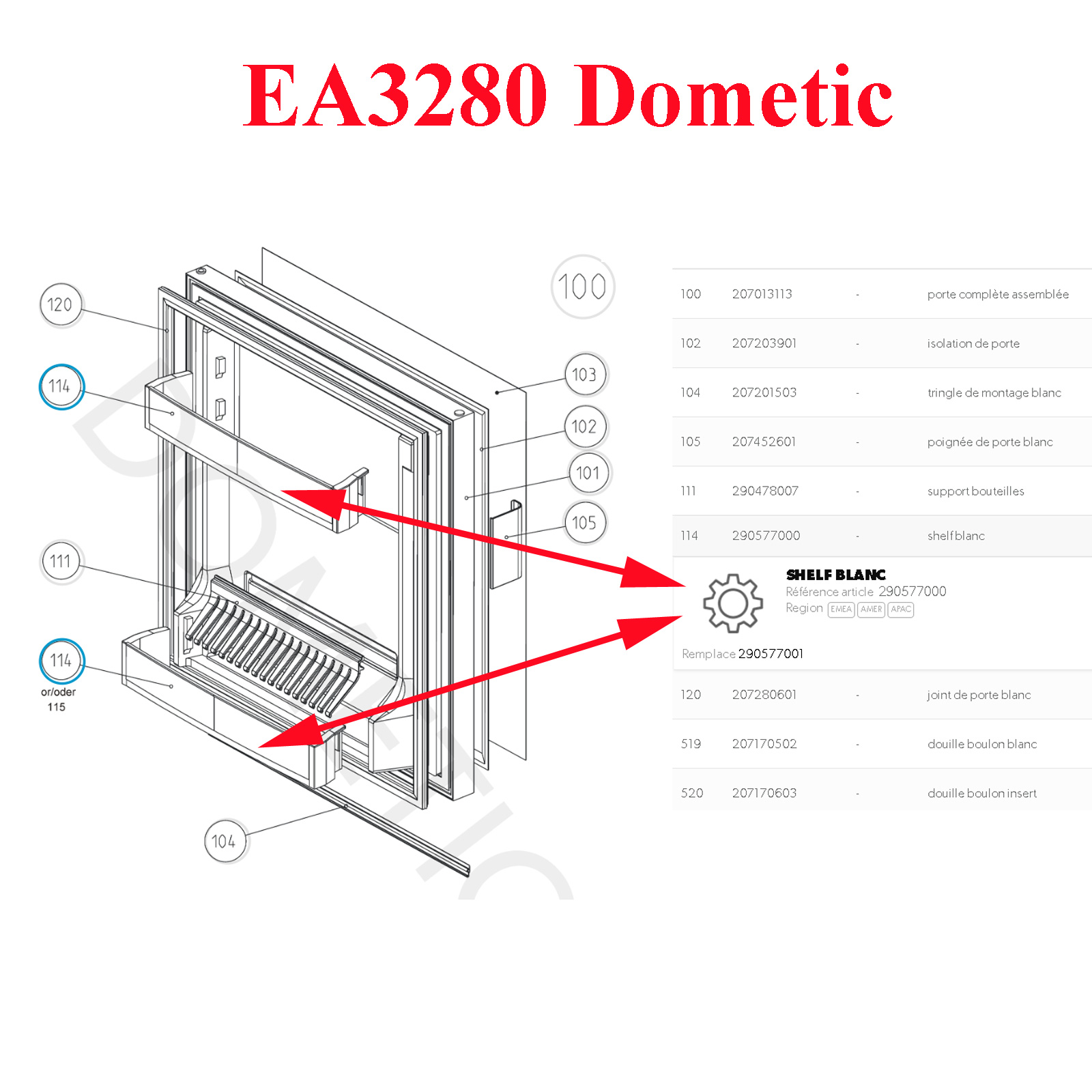 Pour vérifier si votre minibar Dometic comporte bien ce balconnet, merci de nous contacter 01.84.20.86.07 et munissez vous pour vérifier la compatibilité de votre numéro de produit de votre appareil Dometic (qui se trouve sur l’étiquette signalétique à l’intérieur du réfrigérateur).