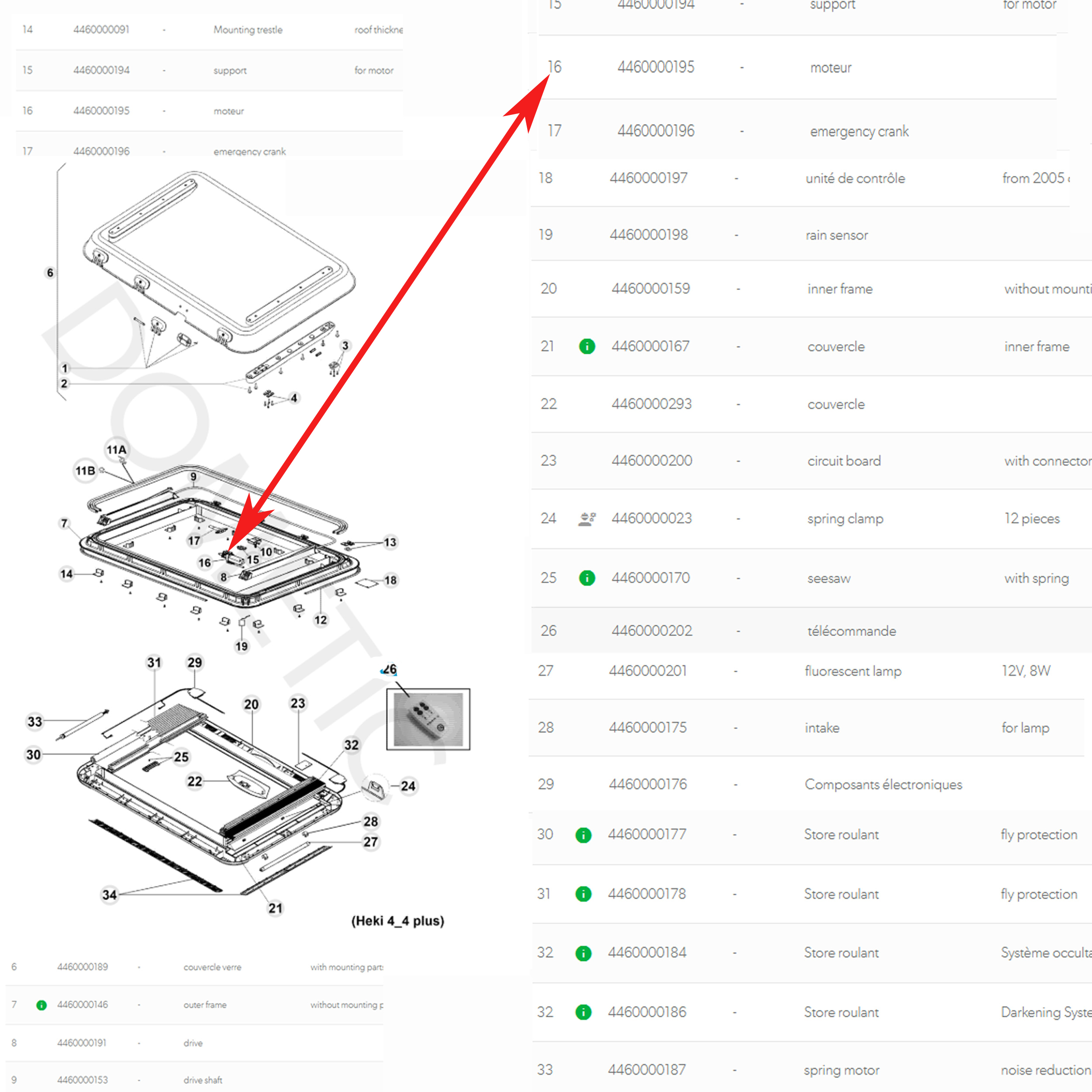 Pour vérifier si votre lanterneau Heki 4, Heki 4 PLUS comporte bien cette piece, merci de nous contacter au 01.84.20.86.07 et munissez vous pour vérifier la compatibilité de votre numéro de produit (PROD NO) de votre appareil Dometic.