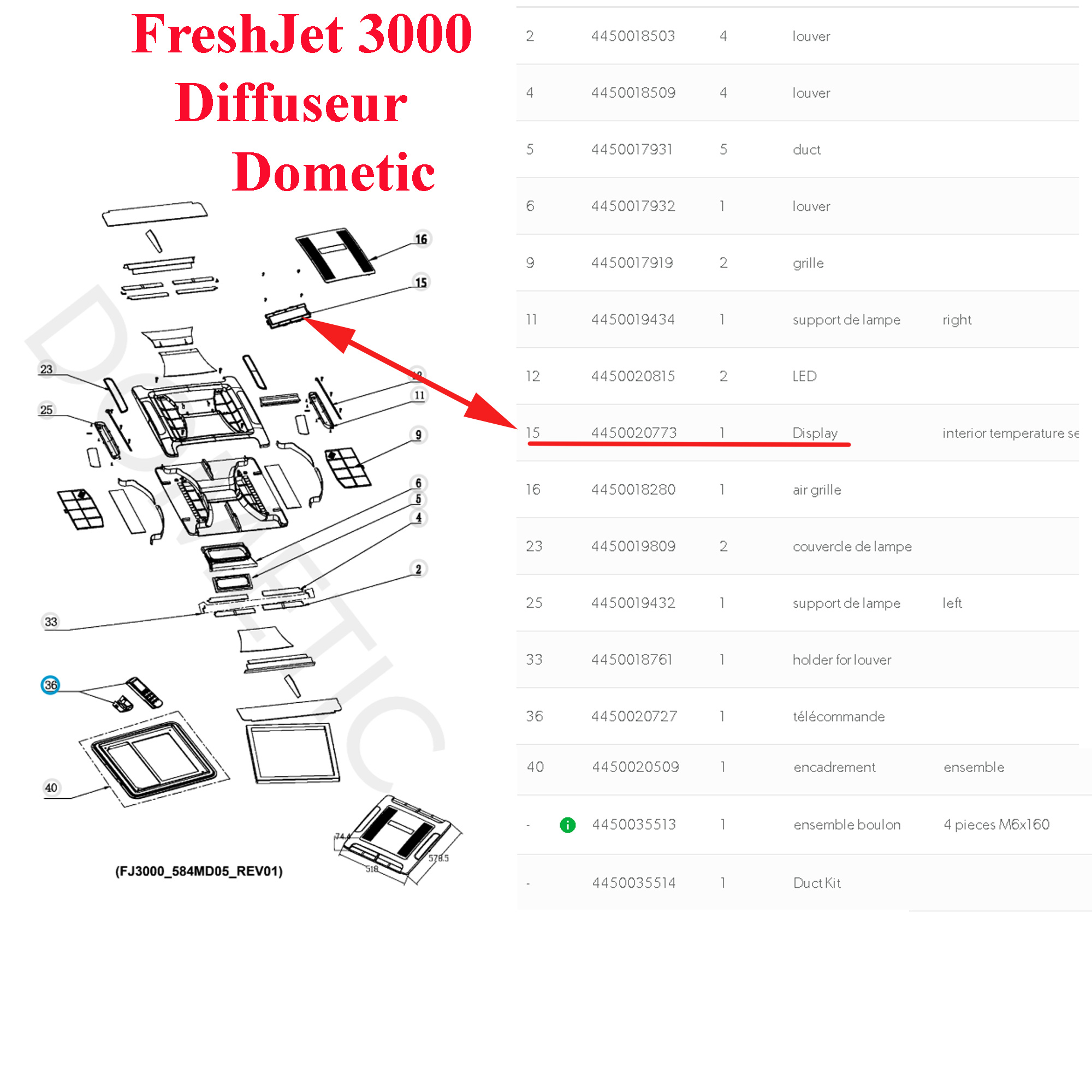 Dometic, panneau de commande (Display) du diffuseur des climatisations de toit : Freshjet FJ3000, HL36HX01RI