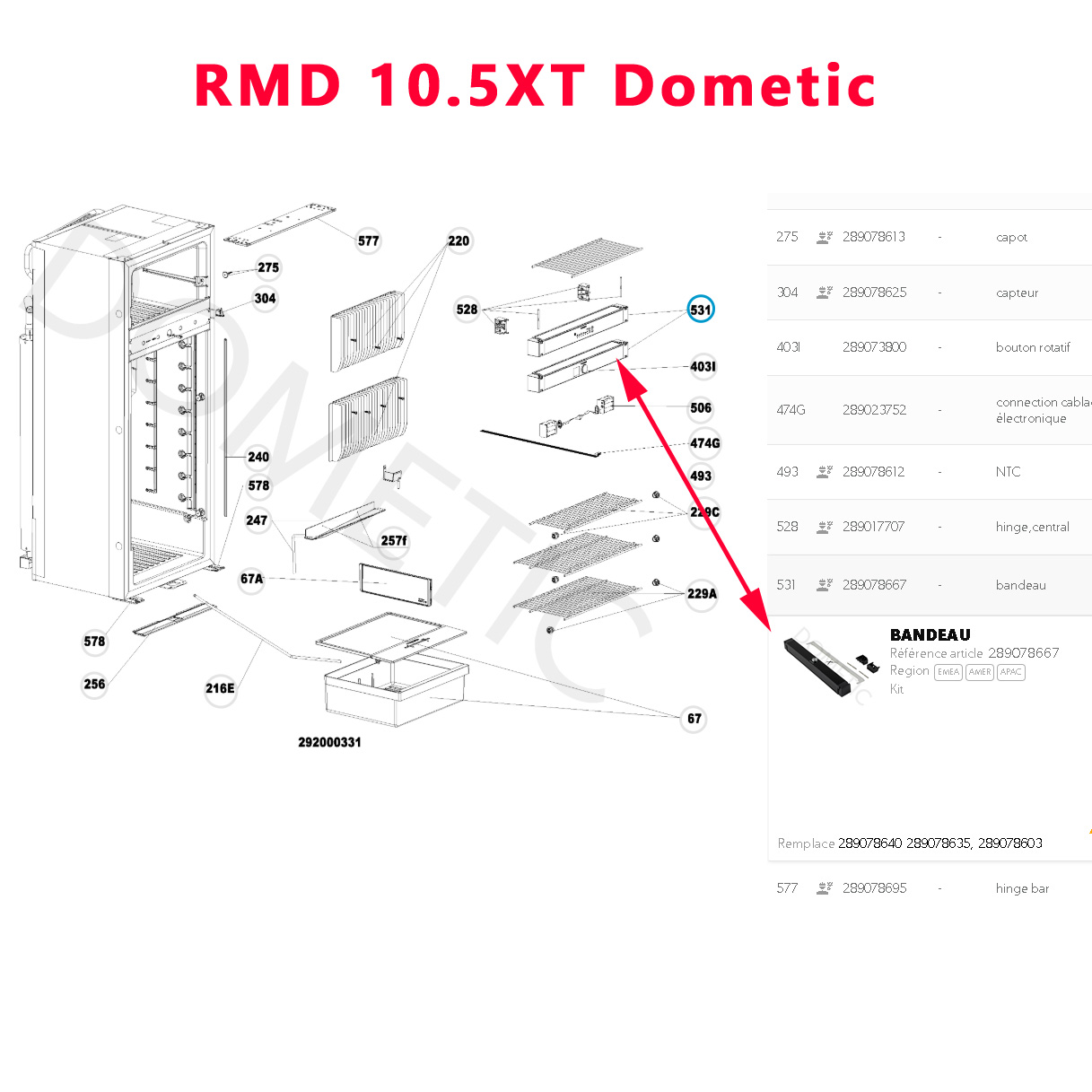 Panneau de commande ou bandeau de commande des refrigerateur RMD10.5T, RMD10.5XT, RMDT10.5T, RMDT10.5XT Dometic