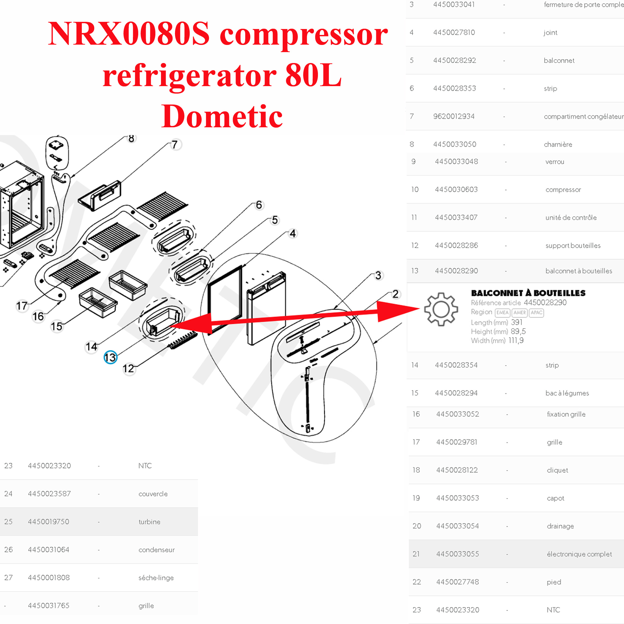 Dometic, porte bouteilles ou balconnet bas pour réfrigérateurs : NRX0090, NRX1080, NRX0080, NRX80