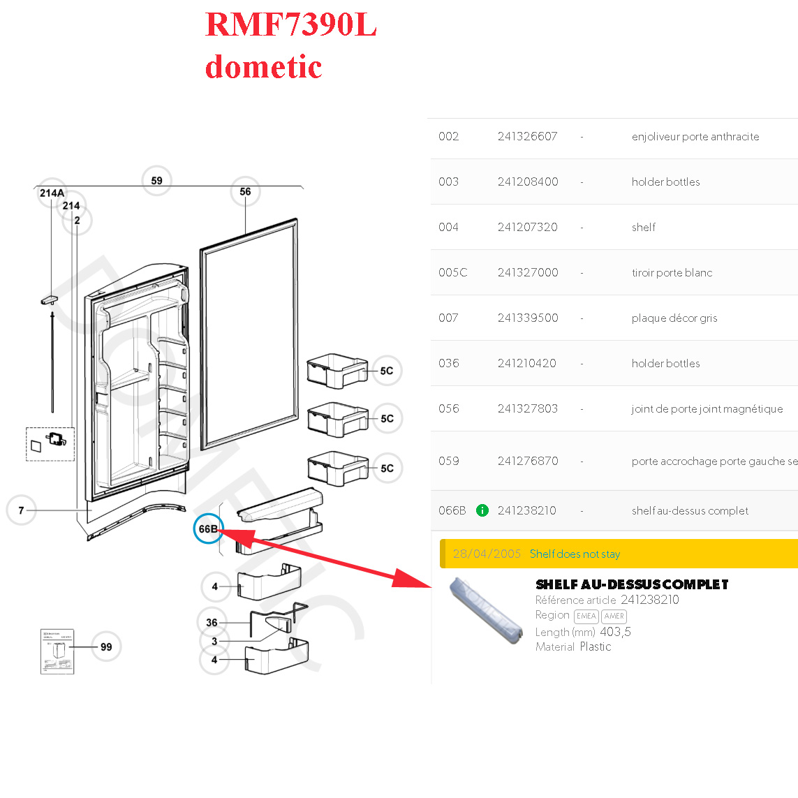 Pour vérifier si votre réfrigérateur Dometic comporte bien ce balconnet, merci de nous contacter 01.84.20.86.07 et munissez vous pour vérifier la compatibilité de votre numéro de produit de votre appareil Dometic (qui se trouve sur l’étiquette signalétique à l’intérieur du réfrigérateur).