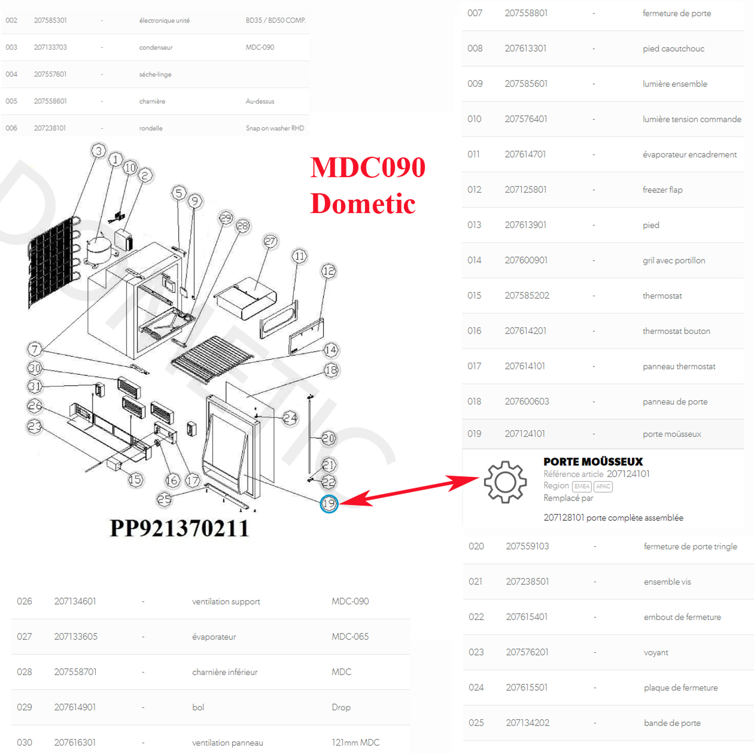 Pour vérifier si votre Réfrigérateur MDC090 comportent bien cette porte, merci de nous contacter tel 01.84.20.86.07 et munissez vous pour vérifier la compatibilité de votre numéro de produit de votre appareil Dometic (qui se trouve sur l’étiquette signalétique que l’on retrouve à l’intérieur du réfrigérateur).