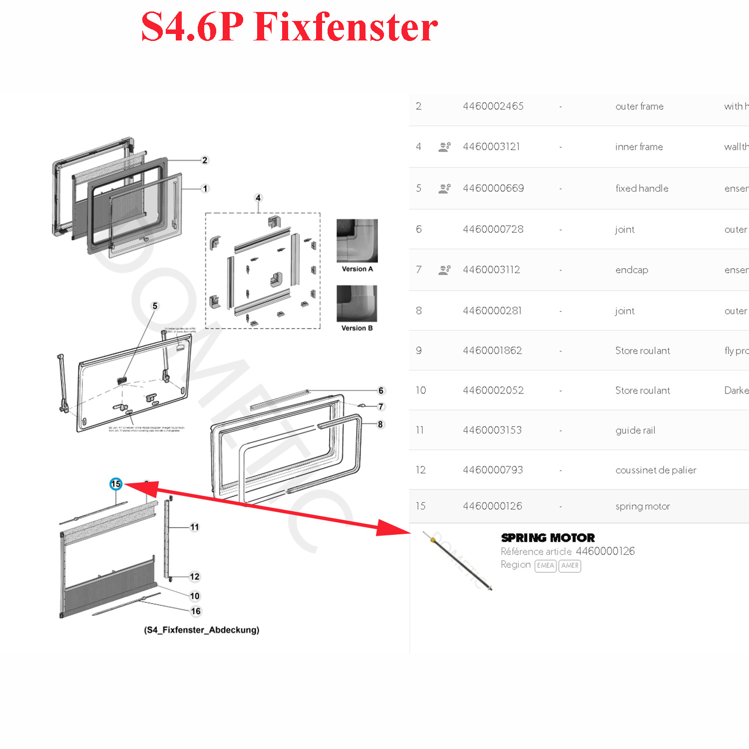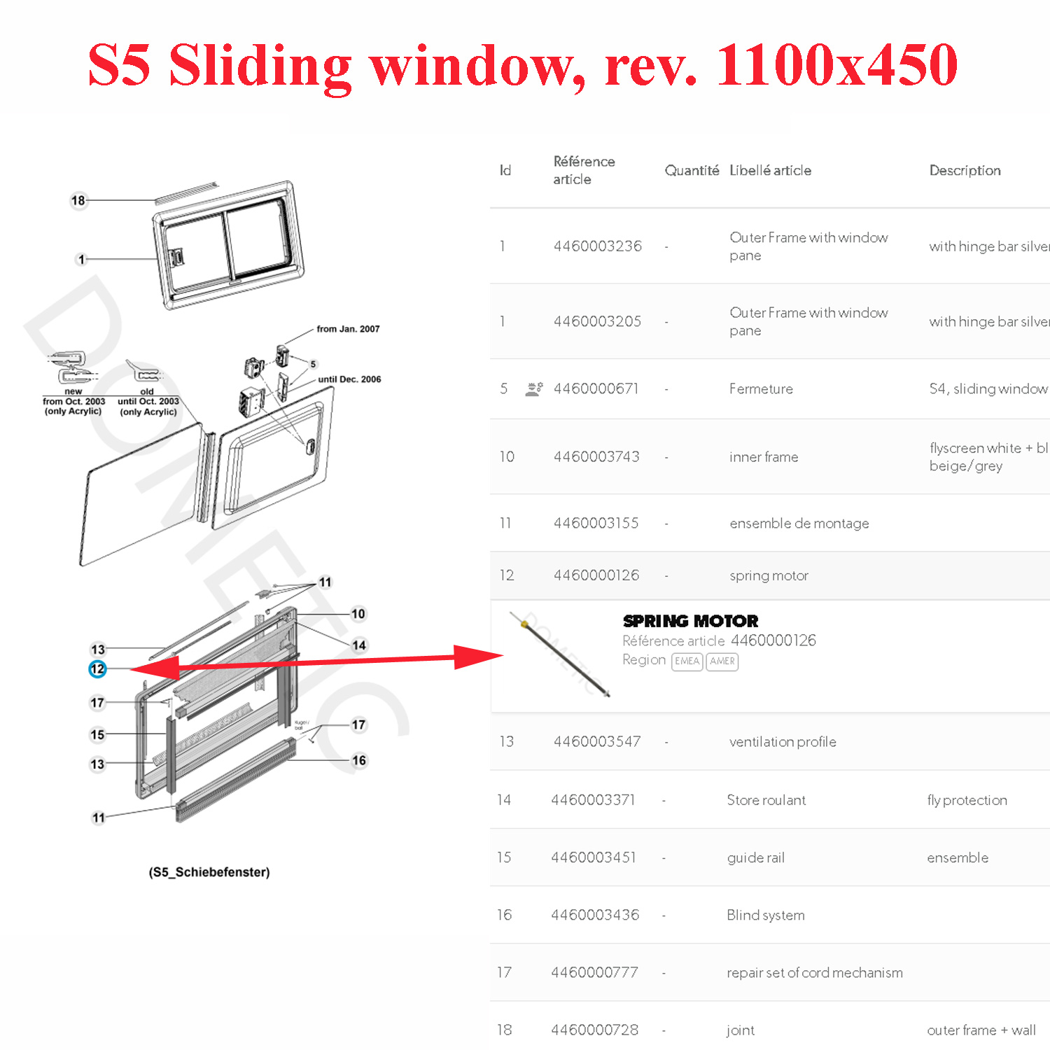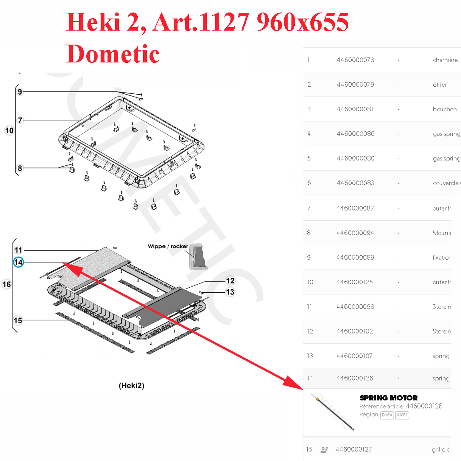 Dometic, ressort de store pour les lanterneaux ou baies suivants : D-Lux.5, Heki 2, Heki2DeLuxe, K6P, Mini-Doppelkass, P6, Rastrollo 3000, Roller blind, RR3000, S4.6, S5, S6
