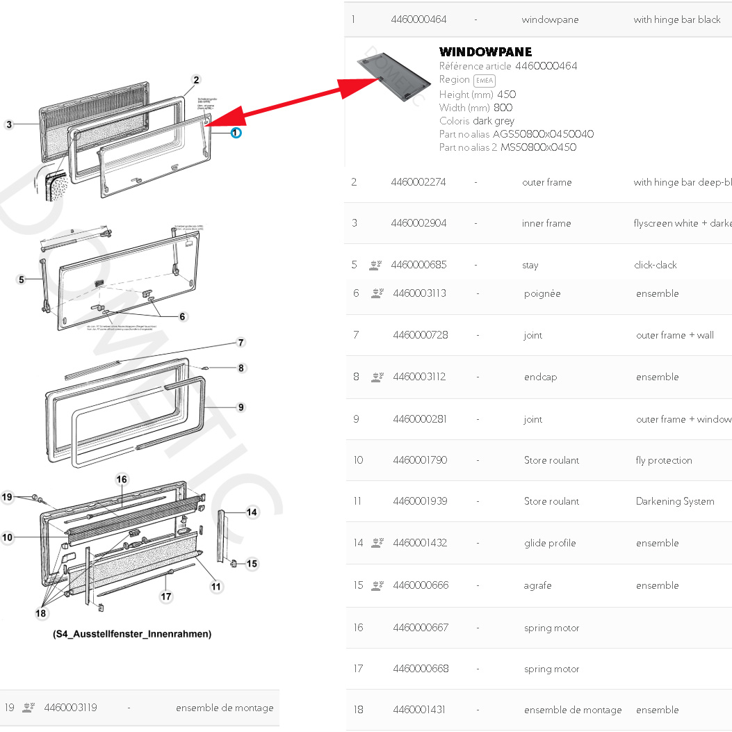 Dometic, vitre plexiglass, ou baie de remplacement de fenêtre de camping-car S5 projetable 800×450 mm AGS50800x0450040 ou MS50800x0450