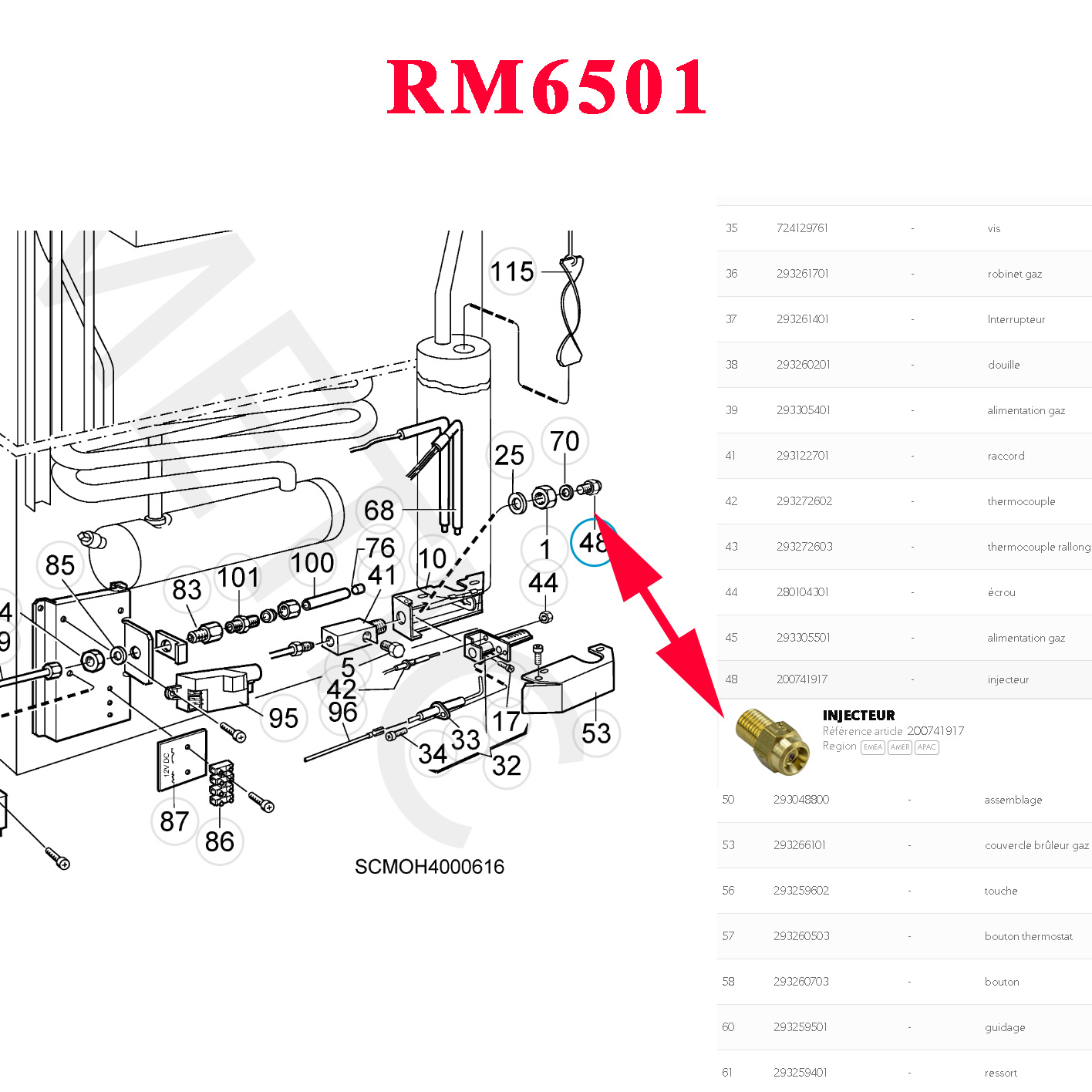 Electrolux Injecteur inscription 51 ou 39 du bruleur des RM7501, RM6501, RM7505, RM6505