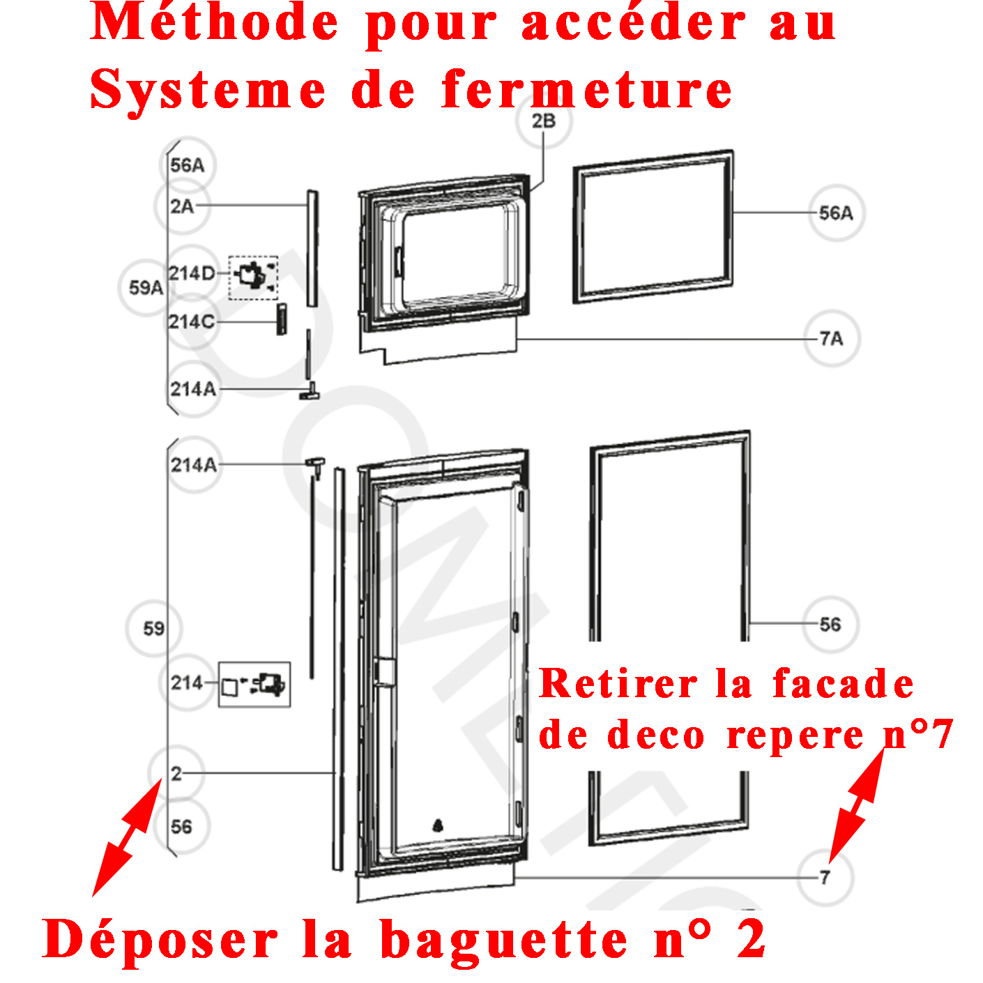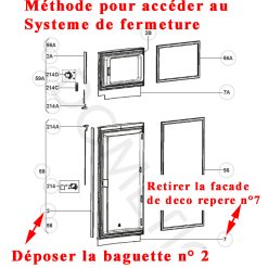 Méthode pour accéder à la serrure : déposez la baguette repère n° 2 (sur le schéma ou la vue éclatée) puis retirez la façade de déco repère n°7 pour accéder au système de fermeture.