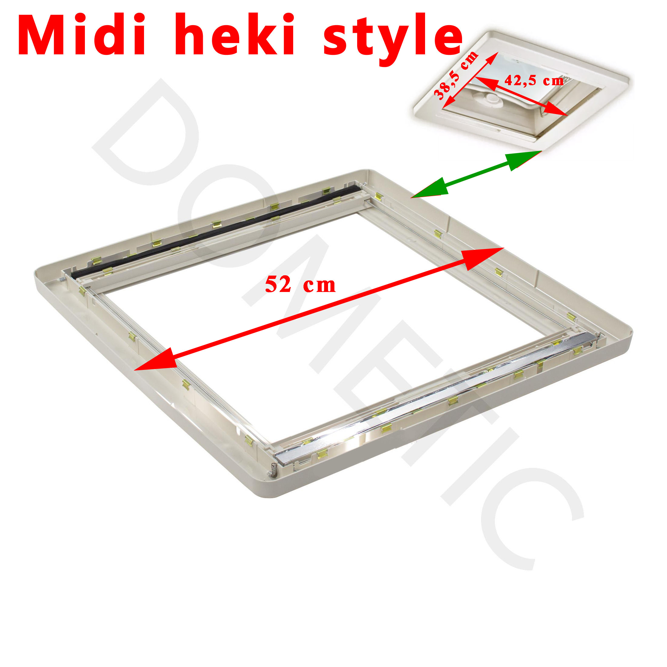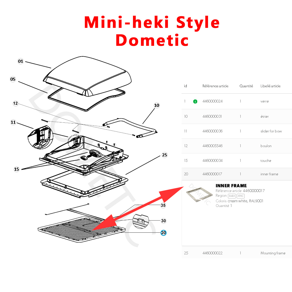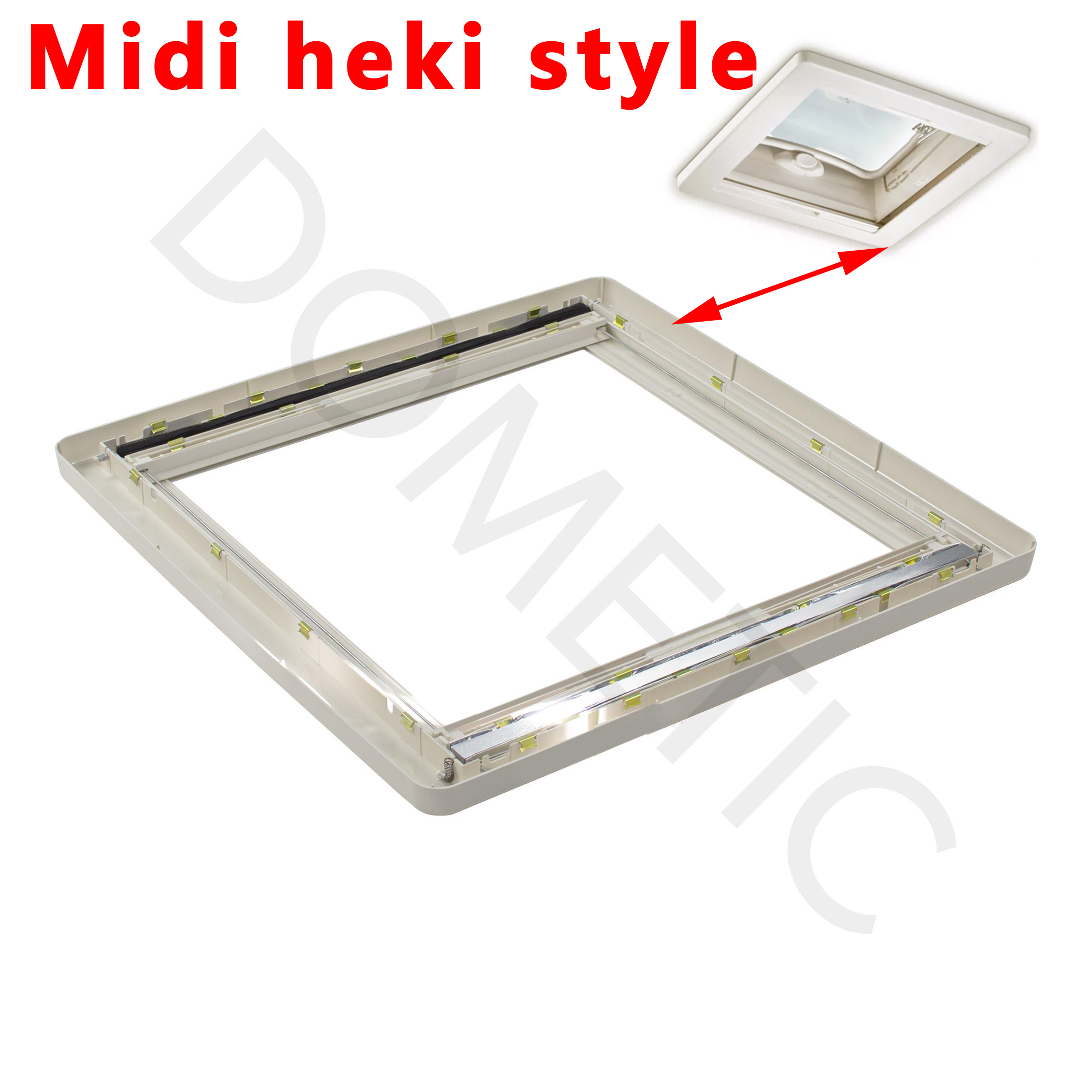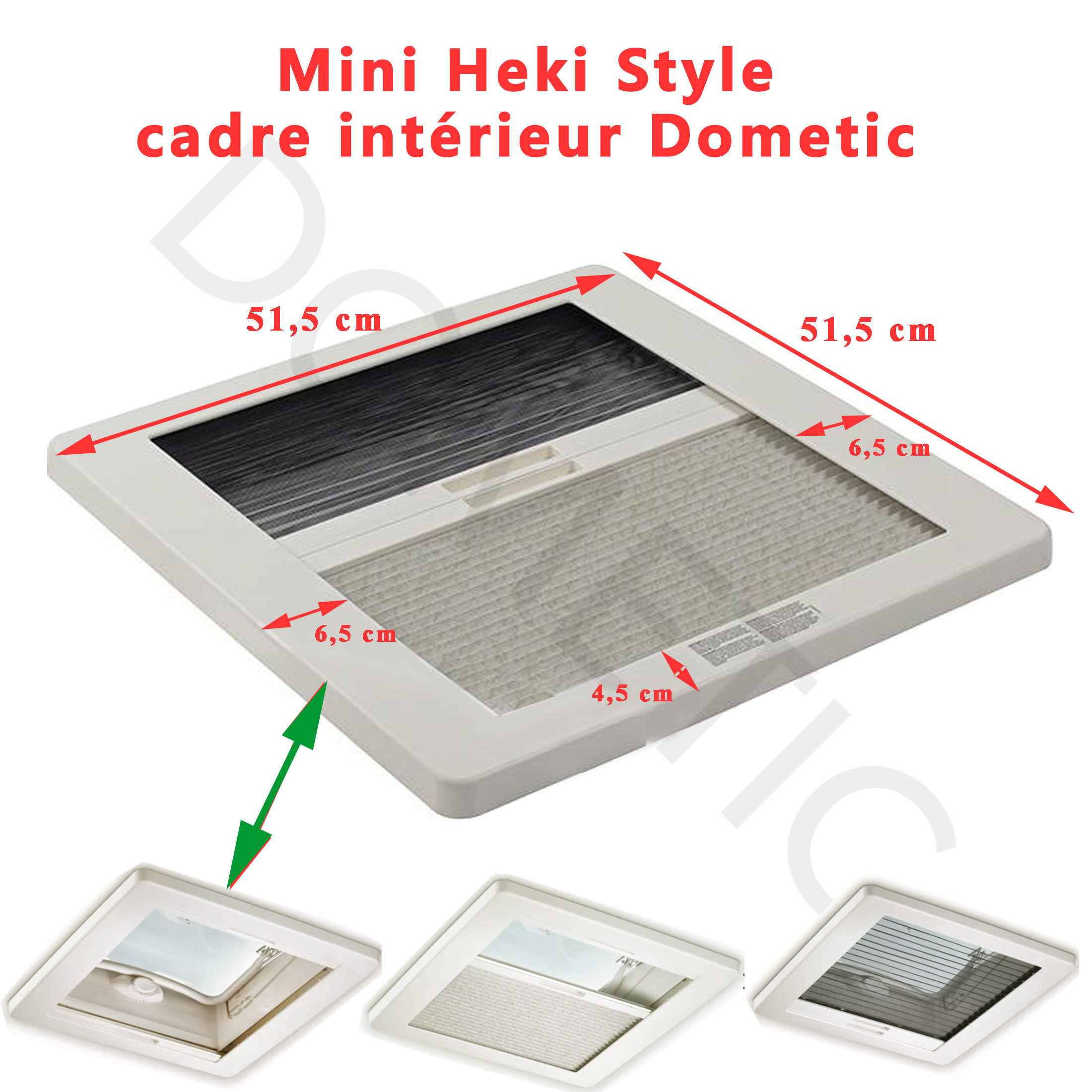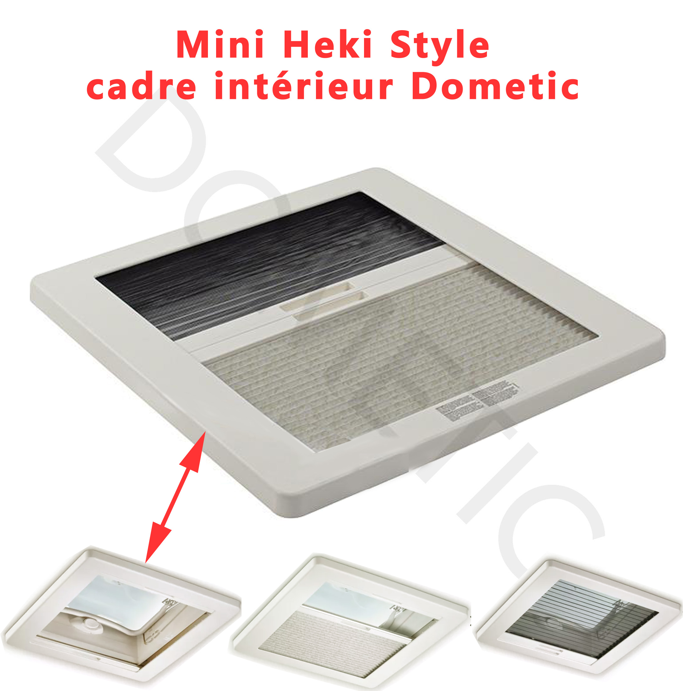 Pour vérifier si votre lanterneau Dometic Mini-heki Style comportent bien ce cadre intérieur, merci de nous contacter tel 01.84.20.86.07 et munissez vous pour vérifier la compatibilité de votre numéro de produit de votre plexiglass Dometic (qui se trouve sur l’étiquette signalétique sur l’angle du plexiglass).