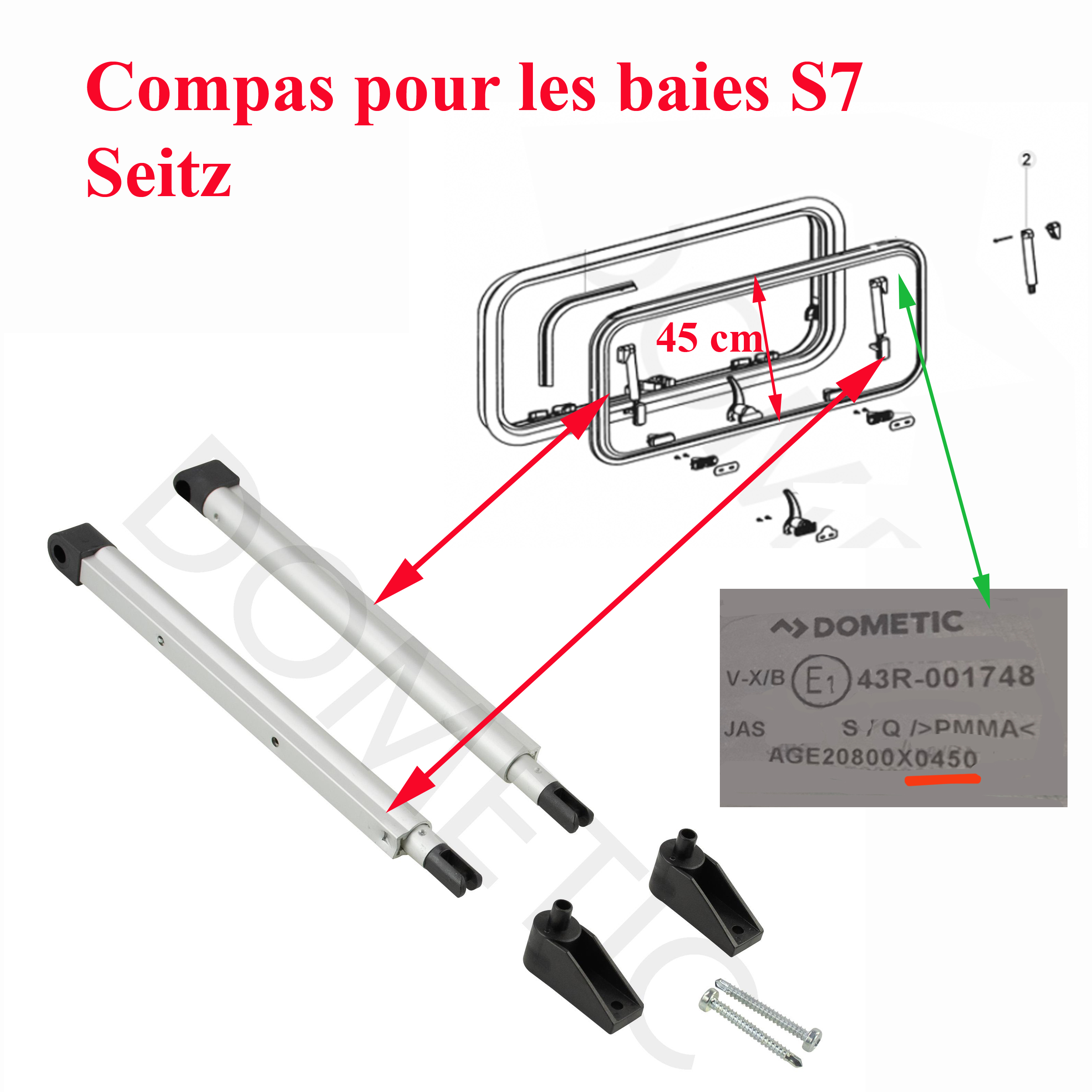 la dimension de 45 cm n’est pas la longueur des compas ou vérin mais celle de la hauteur (du cadre d’encastrement) de la baie de la fenêtre indiqué sur l’autocollant transparent en haut dans l’angle .