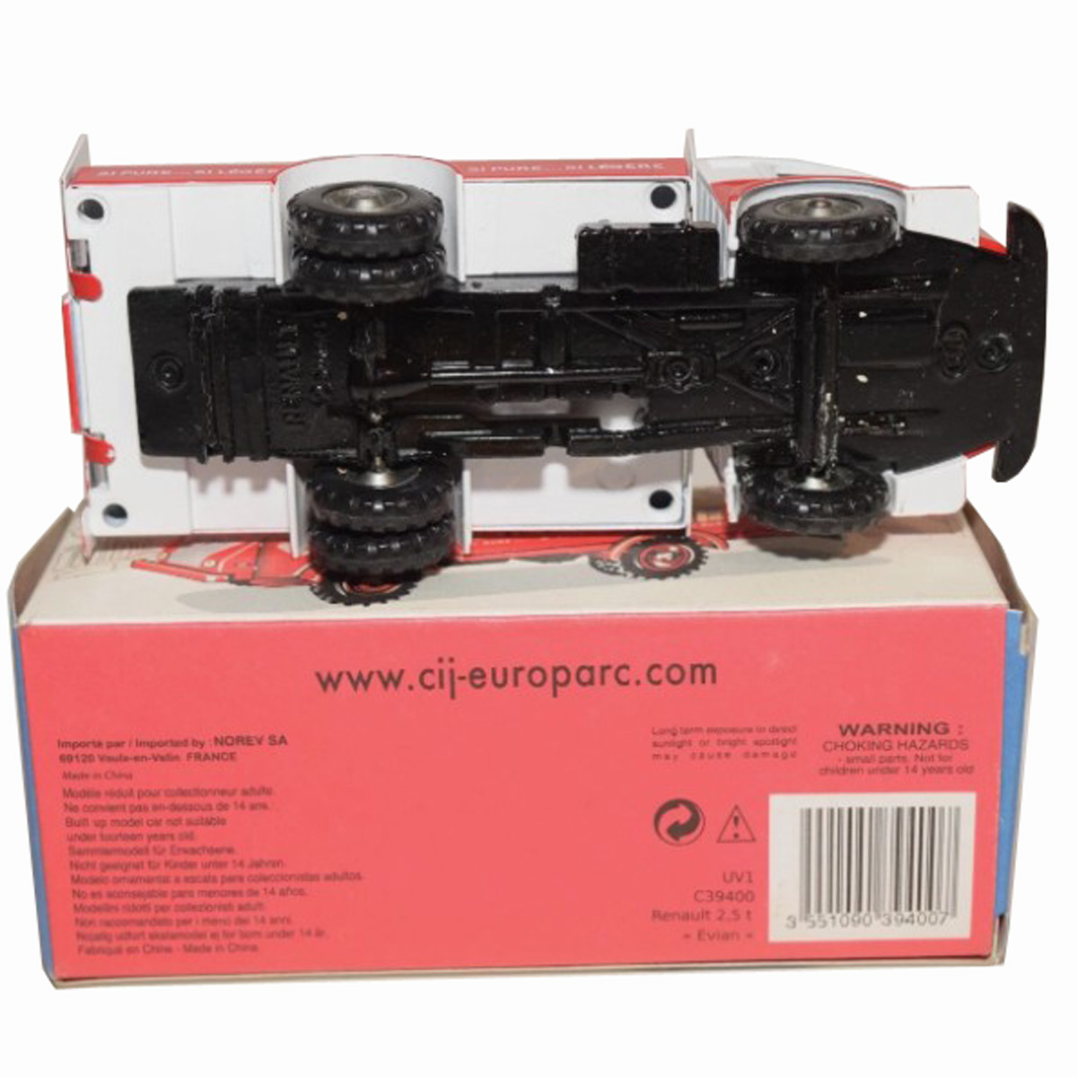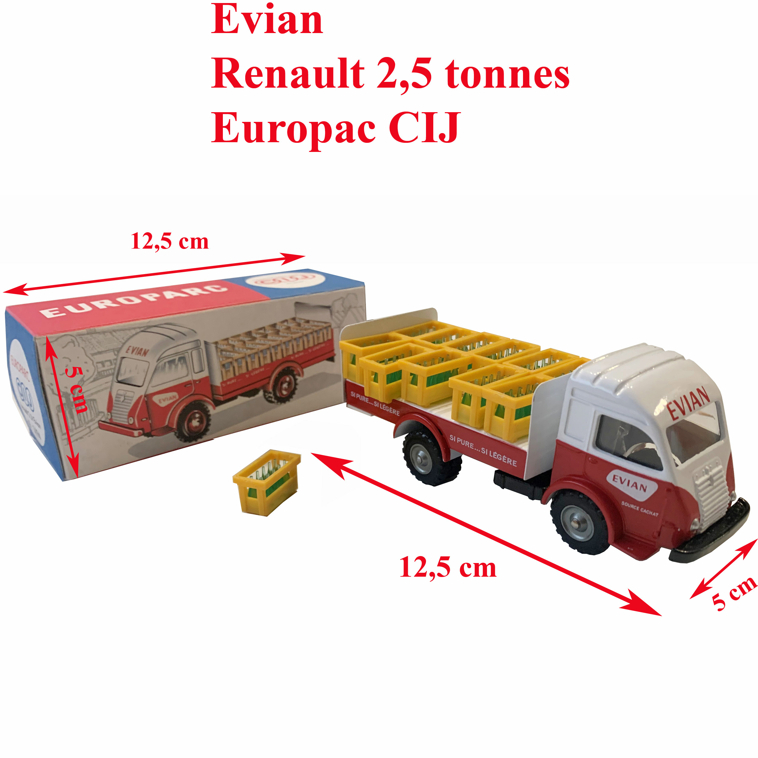 Renault 2.5t Evian au 1/45ème modèle 1955 de CIJ reproduction à l’identique des CIJ en zamac avec un châssis en tôle dont les casiers d’eau sont amovibles , modèle accompagné de sa boite qui est aussi la reproduction du modèle original.