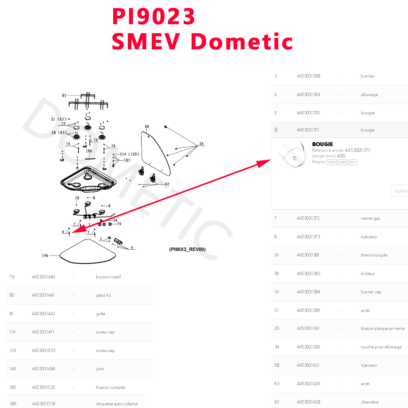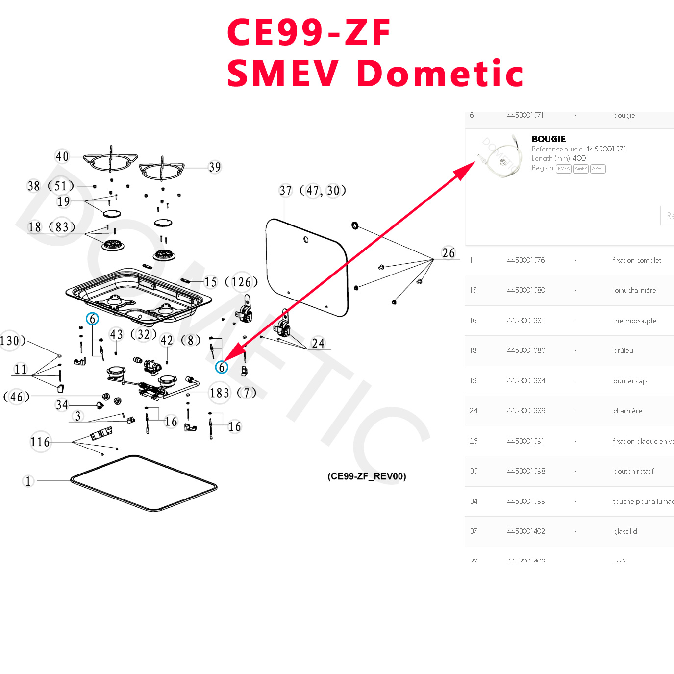 Pour vérifier si votre gazinière comporte bien cette bougie ou allumeur de réchaud, munissez vous pour vérifier la compatibilité de votre numéro de produit de votre appareil Dometic (qui se trouve sur l’étiquette signalétique en dessous de l’appareil) ou contactez nous au 01.84.20.86.07.